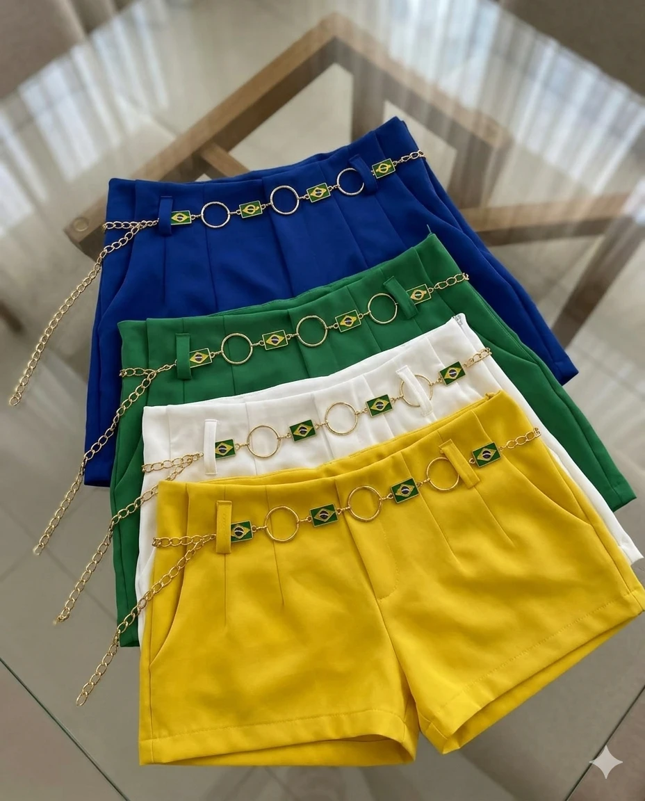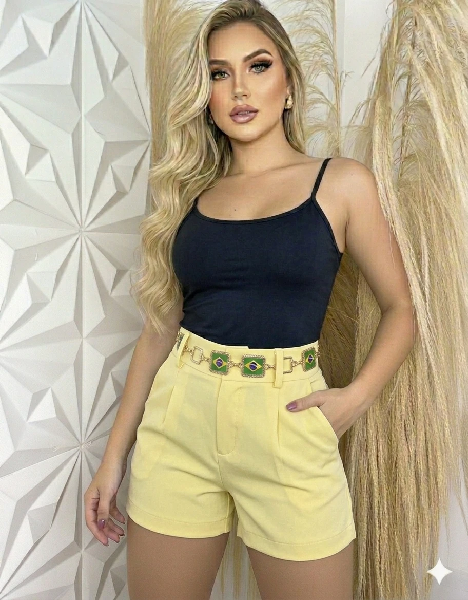 Conjunto feminino moderno com regata de alças finas e short de cintura alta. Tecido macio com caimento suave oferece conforto o dia todo. O cinto decorado com fivelas nas cores do Brasil adiciona estilo único ao look. Use as peças juntas para um visual clean ou combine separadamente com outras favoritas do seu guarda-roupa.